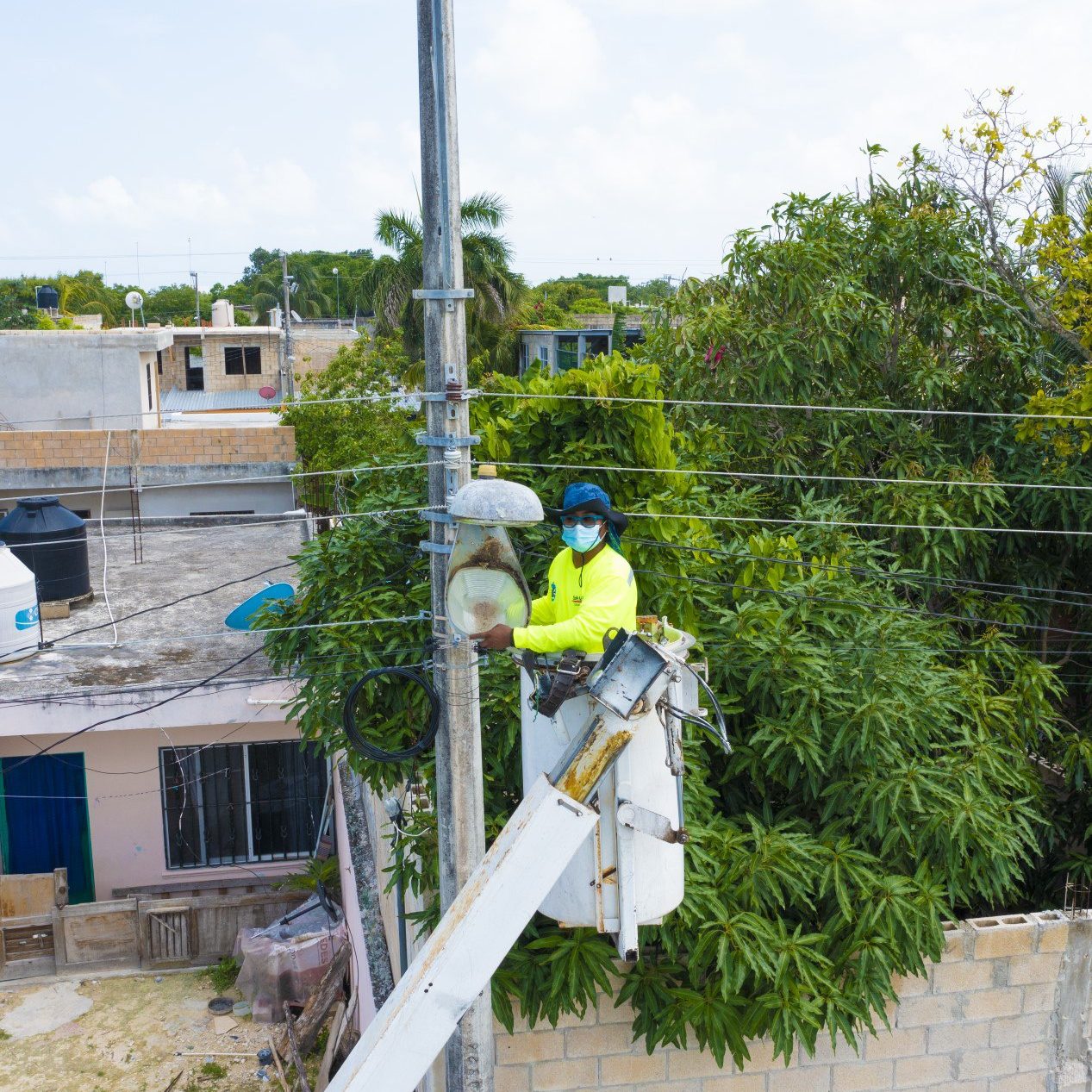 Entre las acciones que se realizan está la poda de árboles con la finalidad de liberar las líneas de energía eléctrica correspondientes al alumbrado público, así como el cambio de focos y balastros y la instalación de cable para reconectar en las luminarias en beneficio de varias colonias de Ciudad Mujeres.
