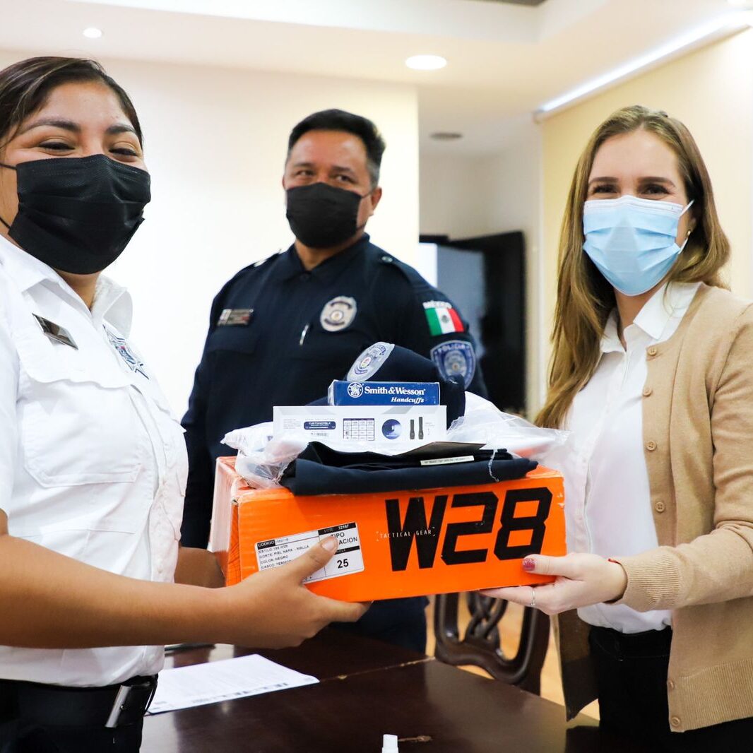 (Isla Mujeres, Quintana Roo a 03 de enero de 2022).-Dentro del marco de la celebración del Día del Policía y en cumplimiento de su compromiso de mantener equipados a los elementos de la corporación de Seguridad Pública, la presidente municipal Atenea Gómez Ricalde, encabezó este lunes la entrega de uniformes y reconocimientos a elementos de la Dirección General de Seguridad Pública y Tránsito Municipal (DGSPyTM).