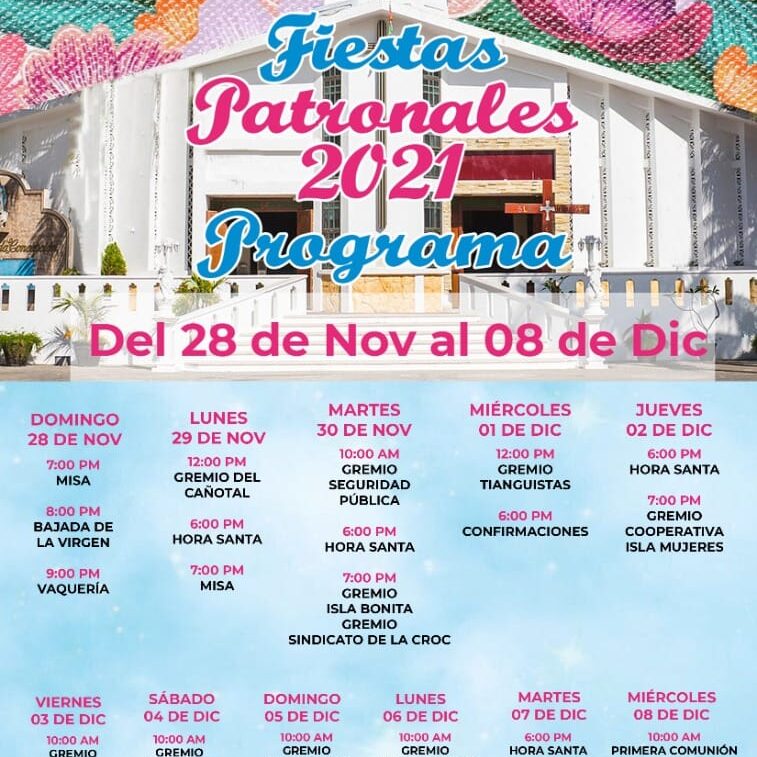 (Isla Mujeres, Quintana Roo a 25 de noviembre de 2021).- Con una misa en honor a la Virgen de la Inmaculada Concepción y una magna vaquería, el próximo 28 de noviembre iniciarán en Isla Mujeres, las fiestas patronales, que de acuerdo con el programa, culminará con una misa, posterior al paseo en la Bahía, el 8 de diciembre.