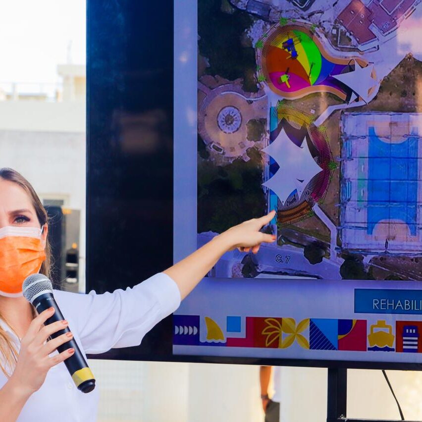 En compañía del director de Obras Públicas, Marcos Velázquez Cabrera, la presidente explicó que a partir de este día, inician los trabajos de rescate de las canchas de futbol rápido y futbol infantil, además del teatro al aire libre, de los baños públicos, del área infantil y de la estructura metálica del domo, todos dentro de la plaza Bicentenario.