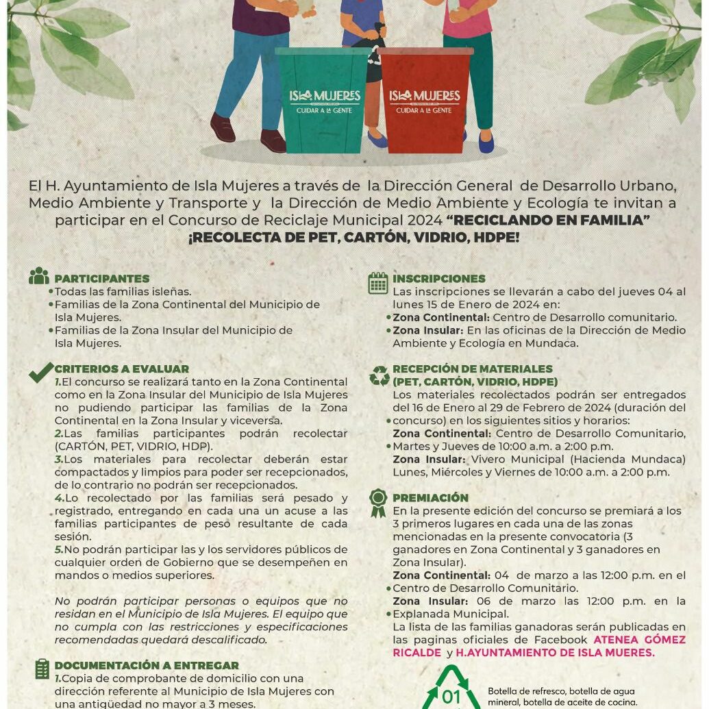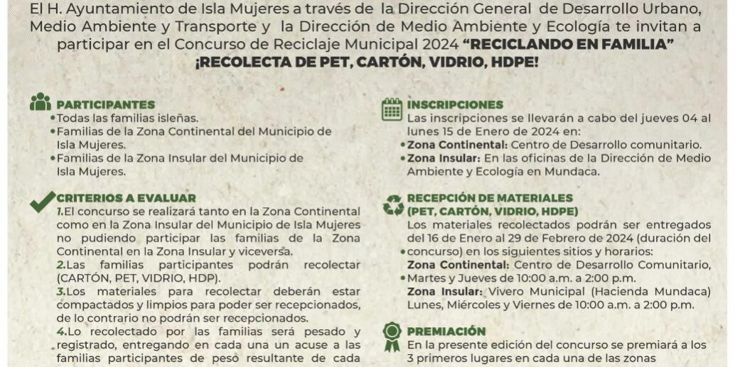 Isla Mujeres, Quintana Roo, 20 de diciembre de 2023.- Con la finalidad de conservar el medio ambiente y promover entornos limpios, ordenados y saludables, el Gobierno Municipal que encabeza la alcaldesa Atenea Gómez Ricalde, a través de la Dirección General de Desarrollo Urbano, Medio Ambiente y Transporte y la Dirección de Medio Ambiente y Ecología, invita a las isleñas e isleños a participar en el Concurso de Reciclaje “Reciclando en Familia”.